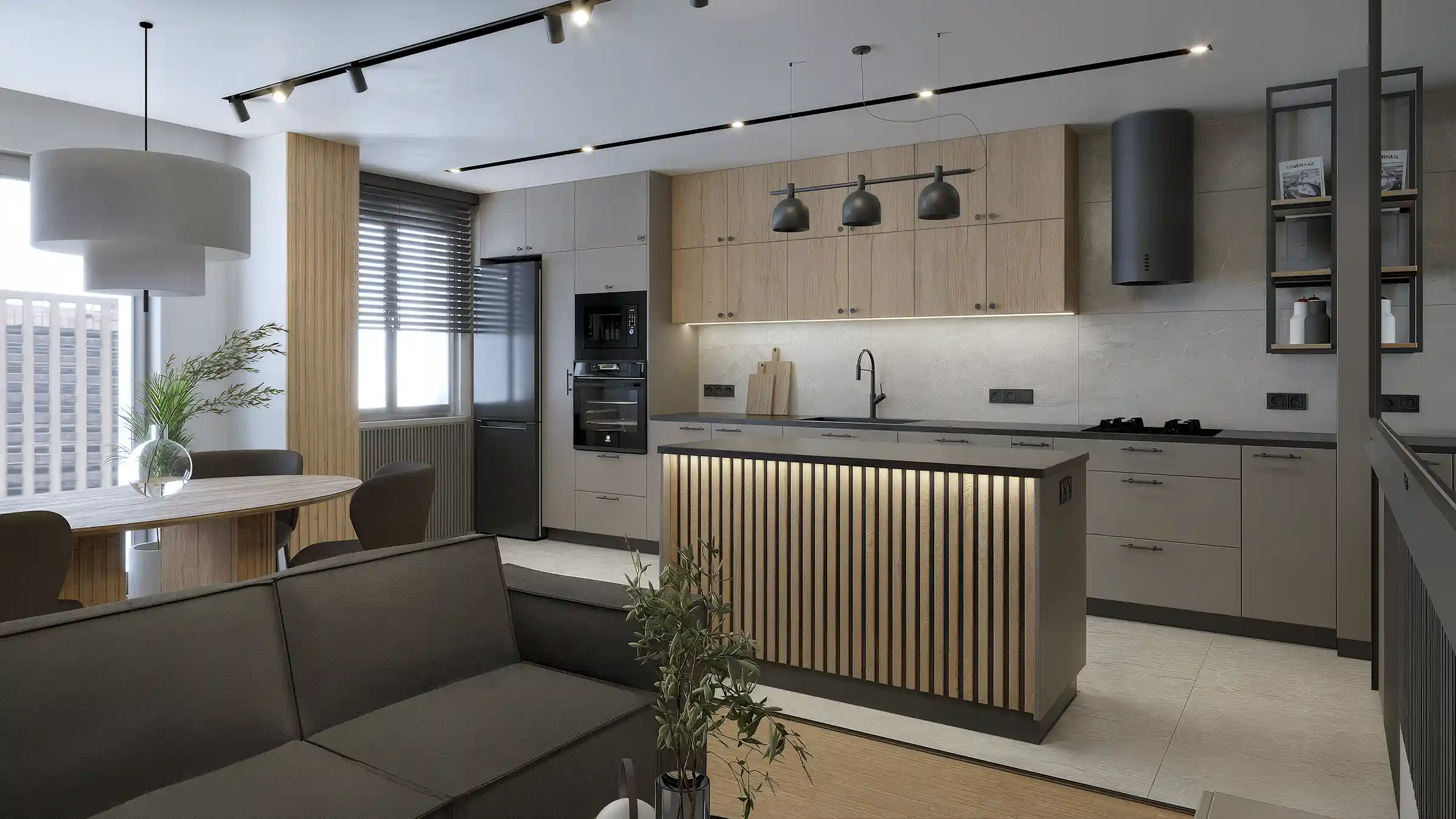 Projekt łączy nowoczesną funkcjonalność z ciepłem naturalnych materiałów, odpowiadając na marzenia klientów o mieszkaniu, które będzie ich codziennym azylem i miejscem spotkań ze znajomymi.
