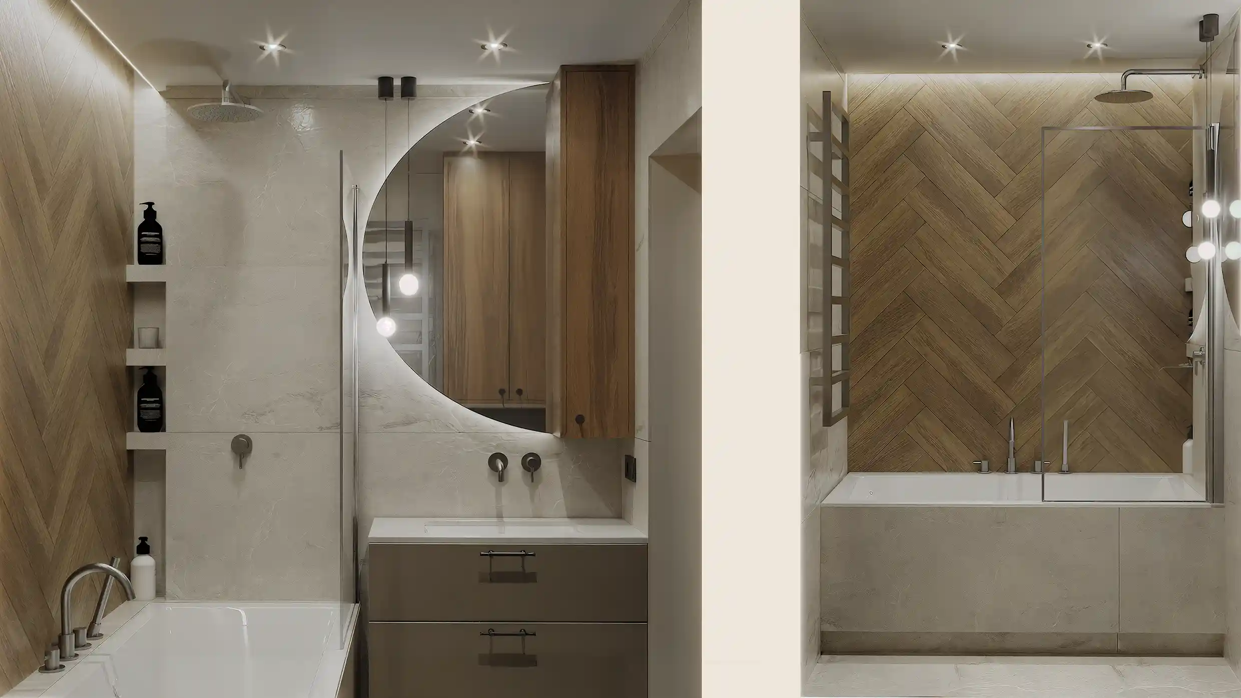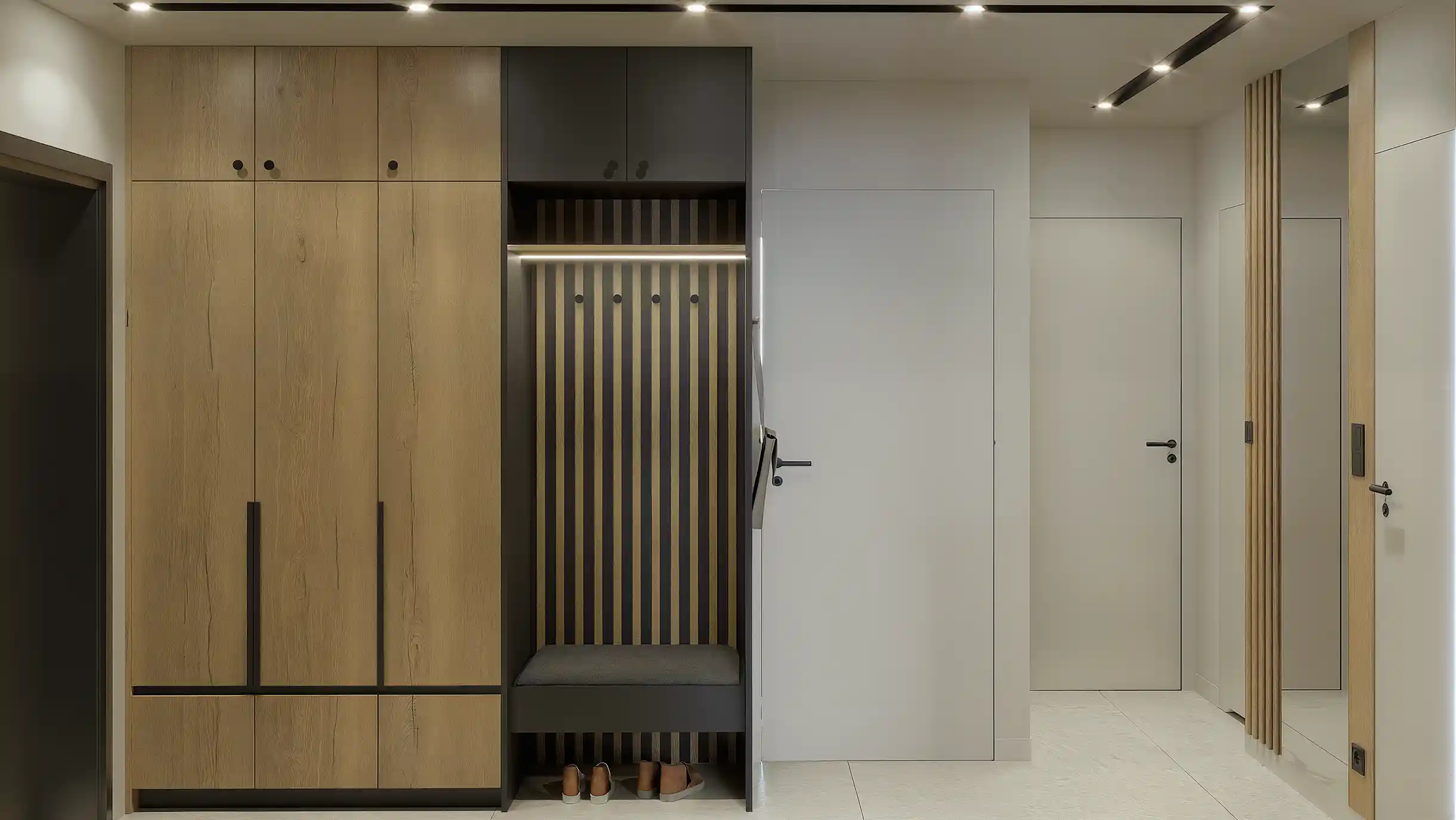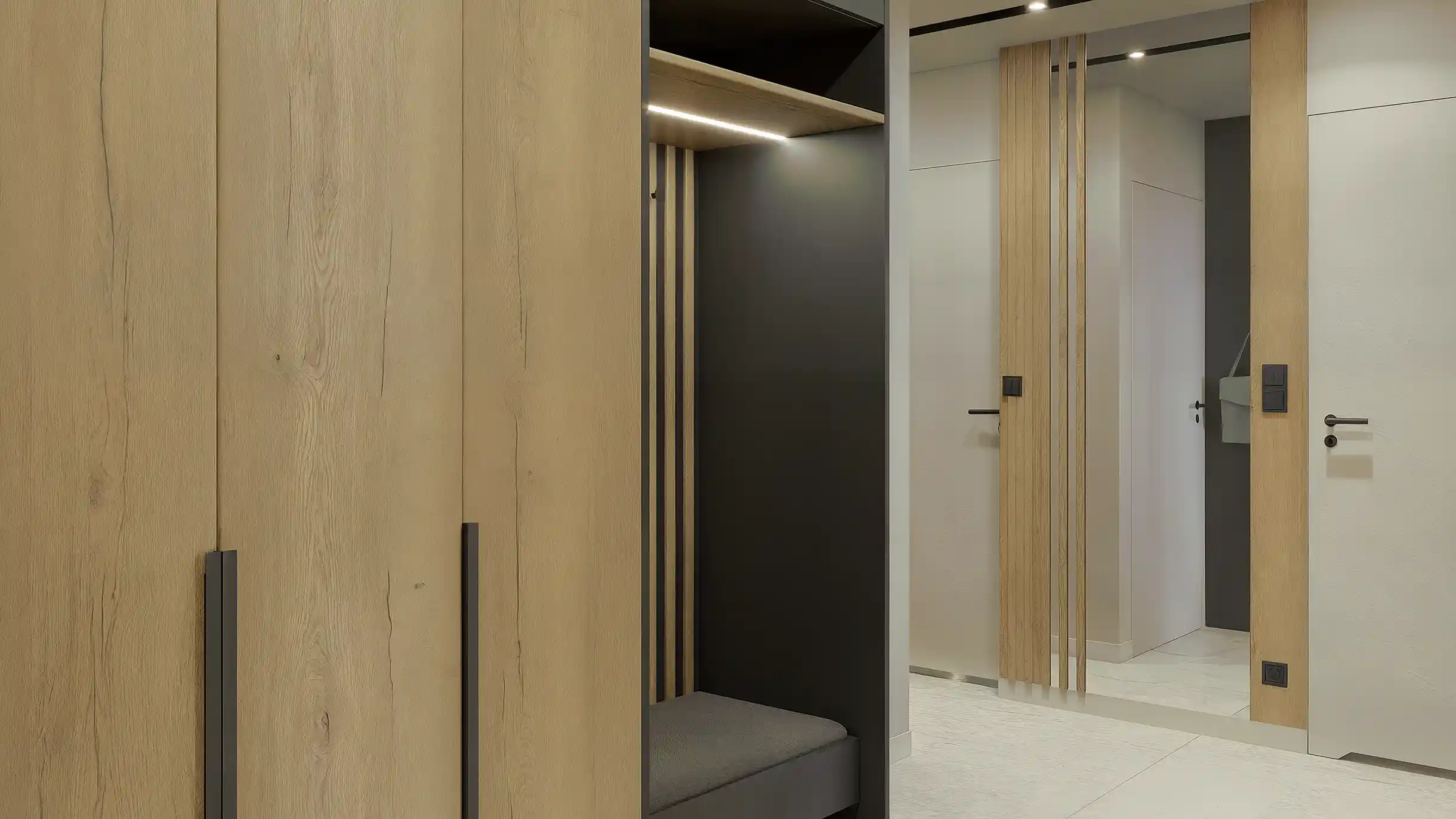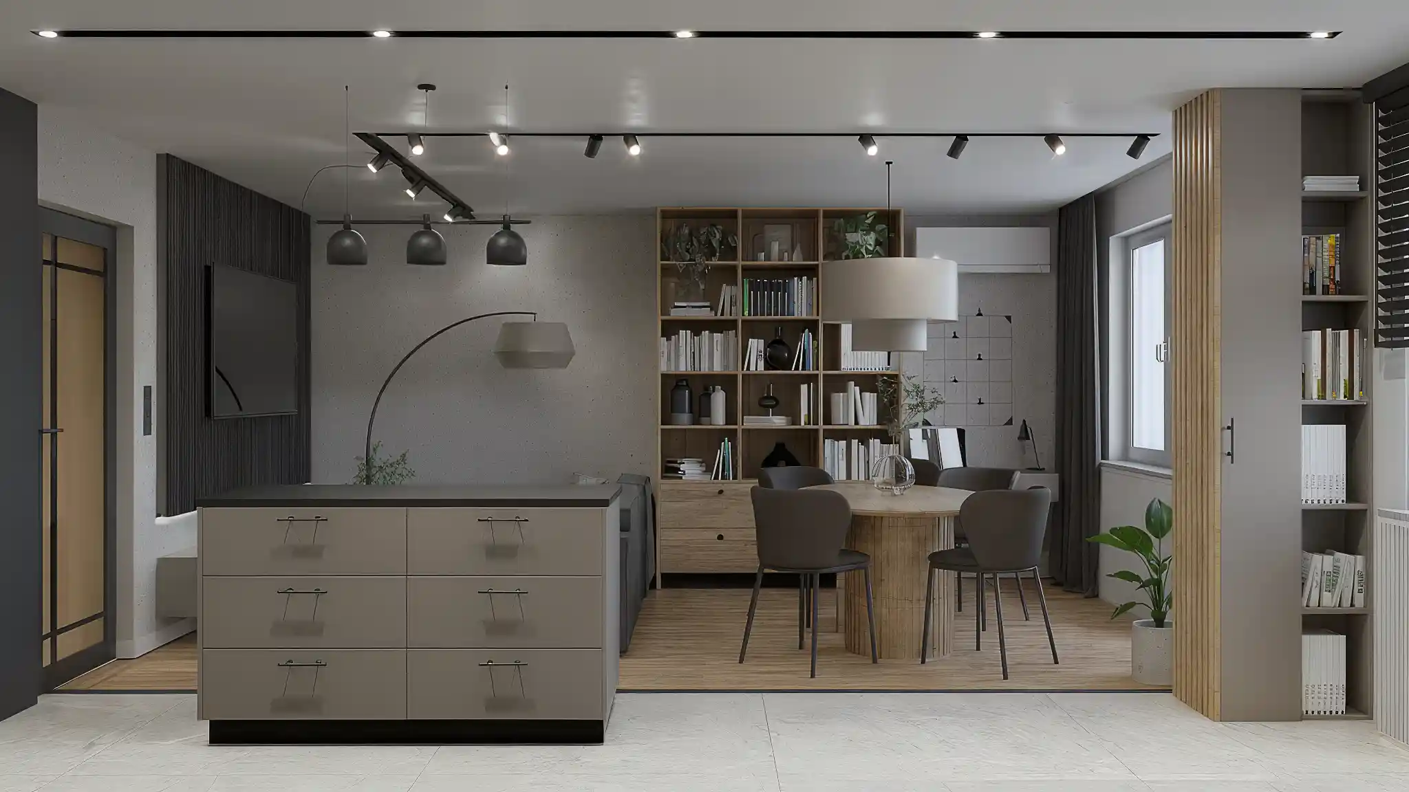 Wnętrze zostało zaprojektowane z myślą o stworzeniu przytulnej, nowoczesnej i funkcjonalnej przestrzeni dla młodej pary, w której dominuje naturalne drewno dębowe, ciepłe odcienie szarości oraz eleganckie, czarne dodatki. Całość uzupełnia klimatyczne oświetlenie – punktowe i dekoracyjne, które podkreśla faktury materiałów oraz tworzy nastrojową atmosferę.