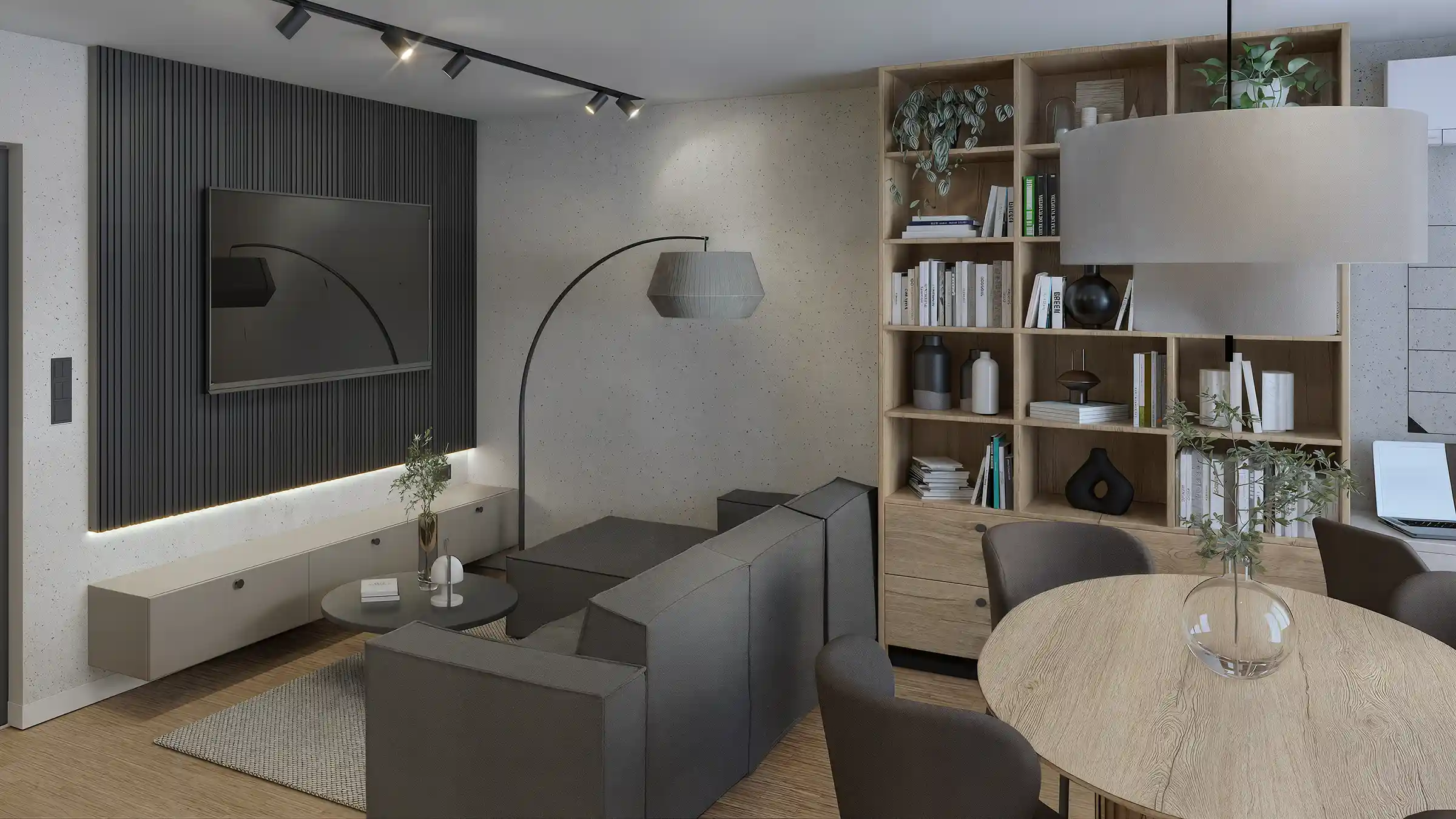 Salon utrzymany w tonacji ciepłej szarości, z drewnianymi akcentami i czarnymi elementami, tworzy eleganckie, a zarazem swobodne miejsce do odpoczynku. Subtelne akcenty roślinne oraz naturalne materiały wprowadzają harmonię i domowy klimat.