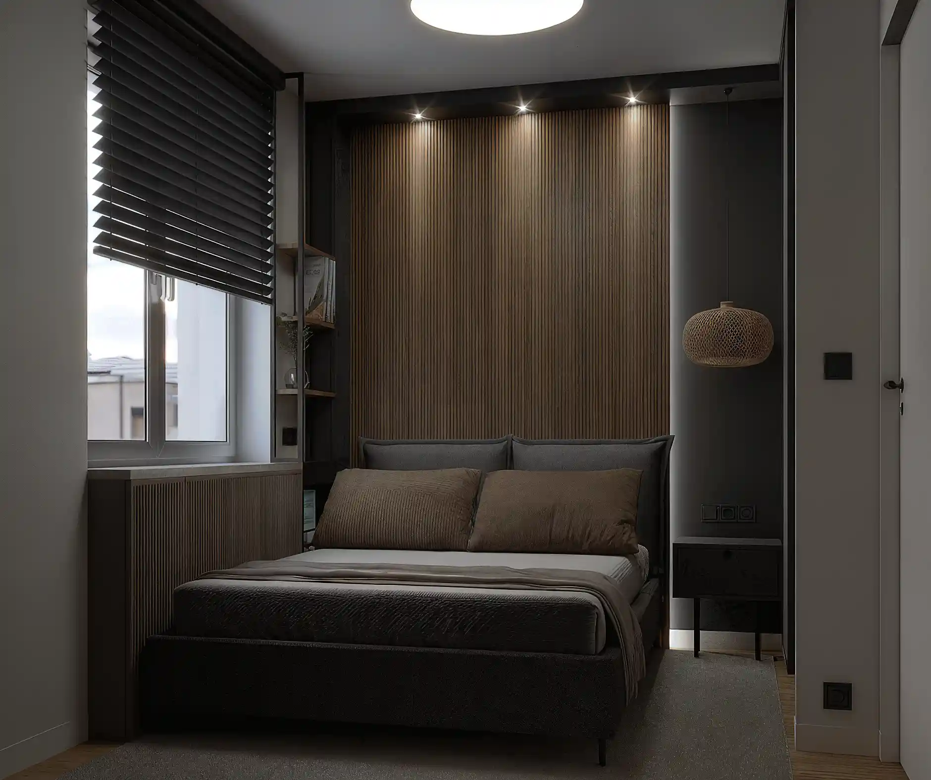 Sypialnia to przytulna, nastrojowa przestrzeń utrzymana w ciemniejszej kolorystyce. Lamele na ścianie za łóżkiem, miękkie tkaniny i stonowane światło sprawiają, że wnętrze sprzyja wyciszeniu i relaksowi.